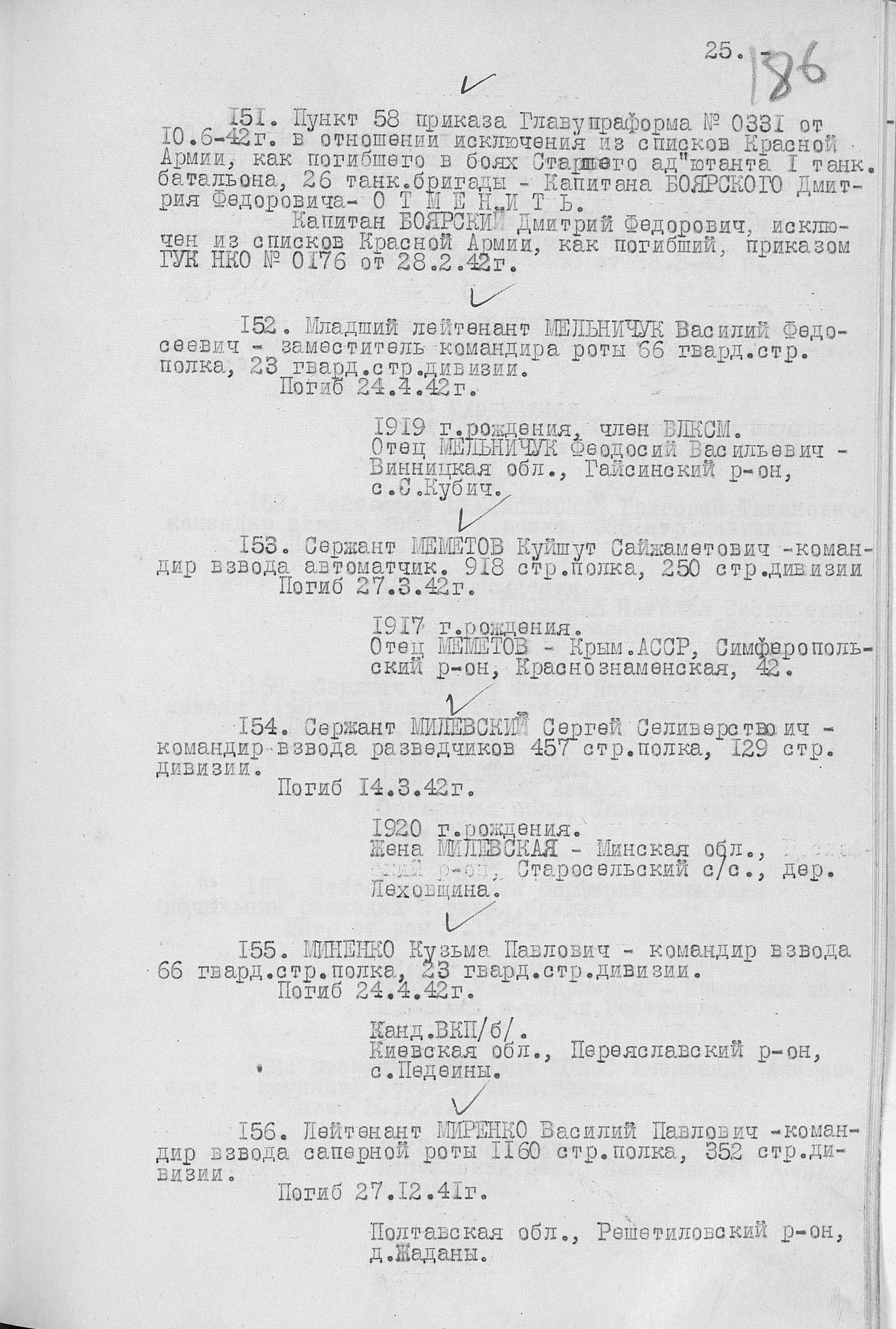 Приказ об исключении из списков. Номер 355. 14.06.1942. Источник: ГУФ и УВ КА. Страница 27 Перейти к списку