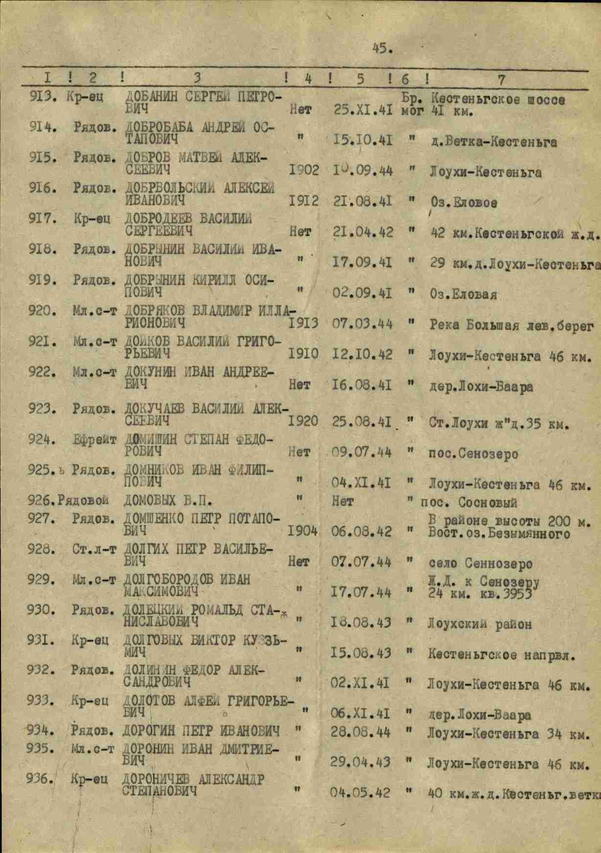 Списки захоронений из архива ЦАМО. Выбывший Докунин Иван Андреевич 16.08.1941г. Перейти к списку
