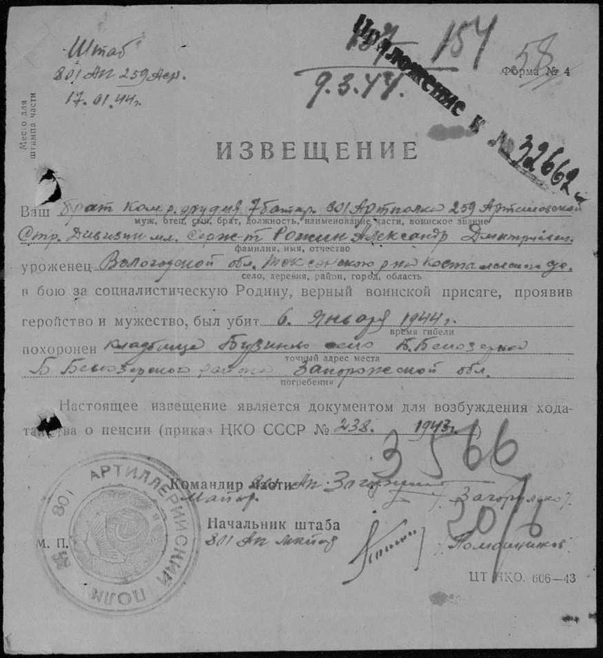 Извещения боевых частей. Номер 32662. 16.06.1944. Источник: Вологодский обл. ВК. Страница 109 Перейти к списку