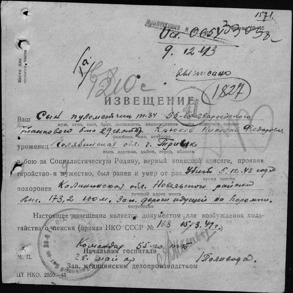 Извещения боевых частей. Номер 163579. 11.12.1945. Источник: Дзержинский РВК. Страница 47 Перейти к списку