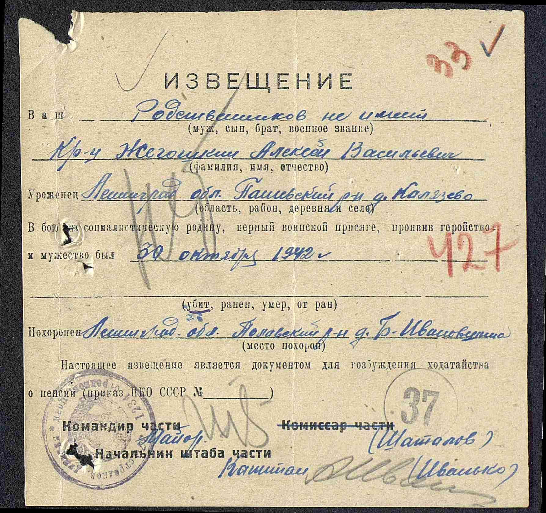 Извещения боевых частей. Номер 37804. 24.09.1943. Источник: 1 отдел ЦБП. Страница 647 Перейти к списку