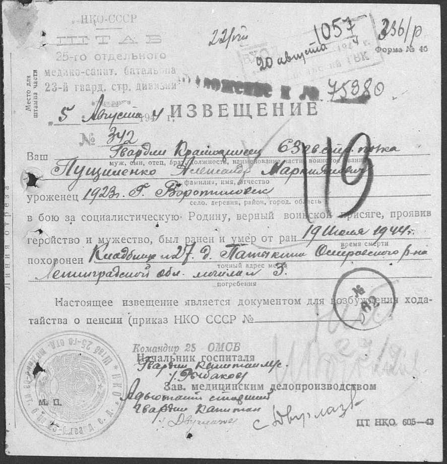 Извещения боевых частей. Номер 75028. 20.09.1944. Источник: Сестрорецкий РВК. Страница 6 Перейти к списку