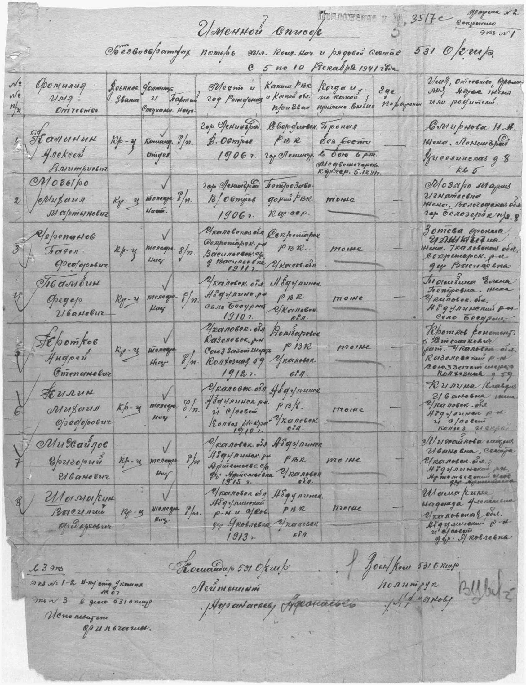 Именной список о безвозратных потерях 531 ОКШР 32 армии Перейти к списку