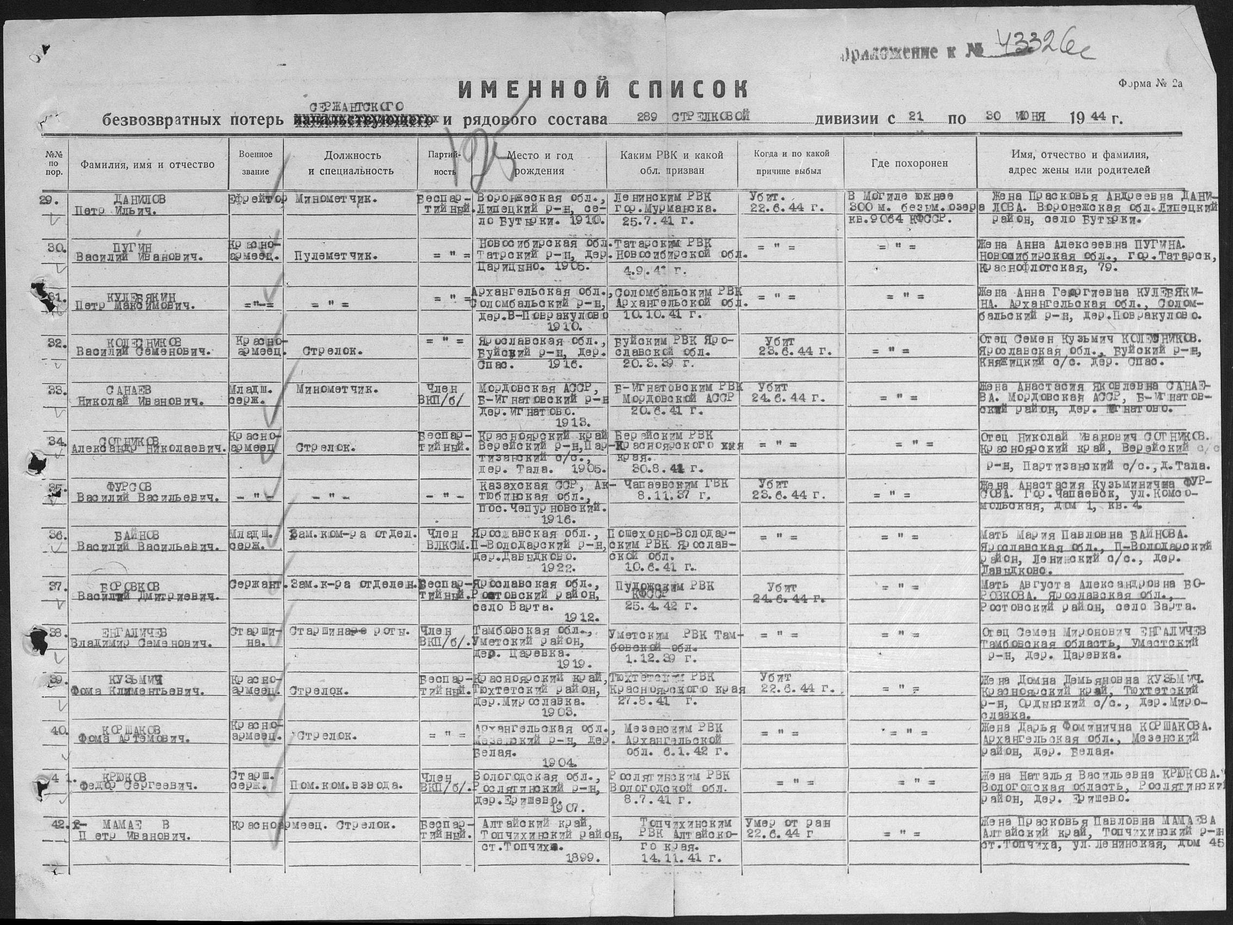Именной список безвозвратных потерь сержантского и рядового состава 289 стрелковой дивизии с 21 по 30 июня 1944 года Перейти к списку