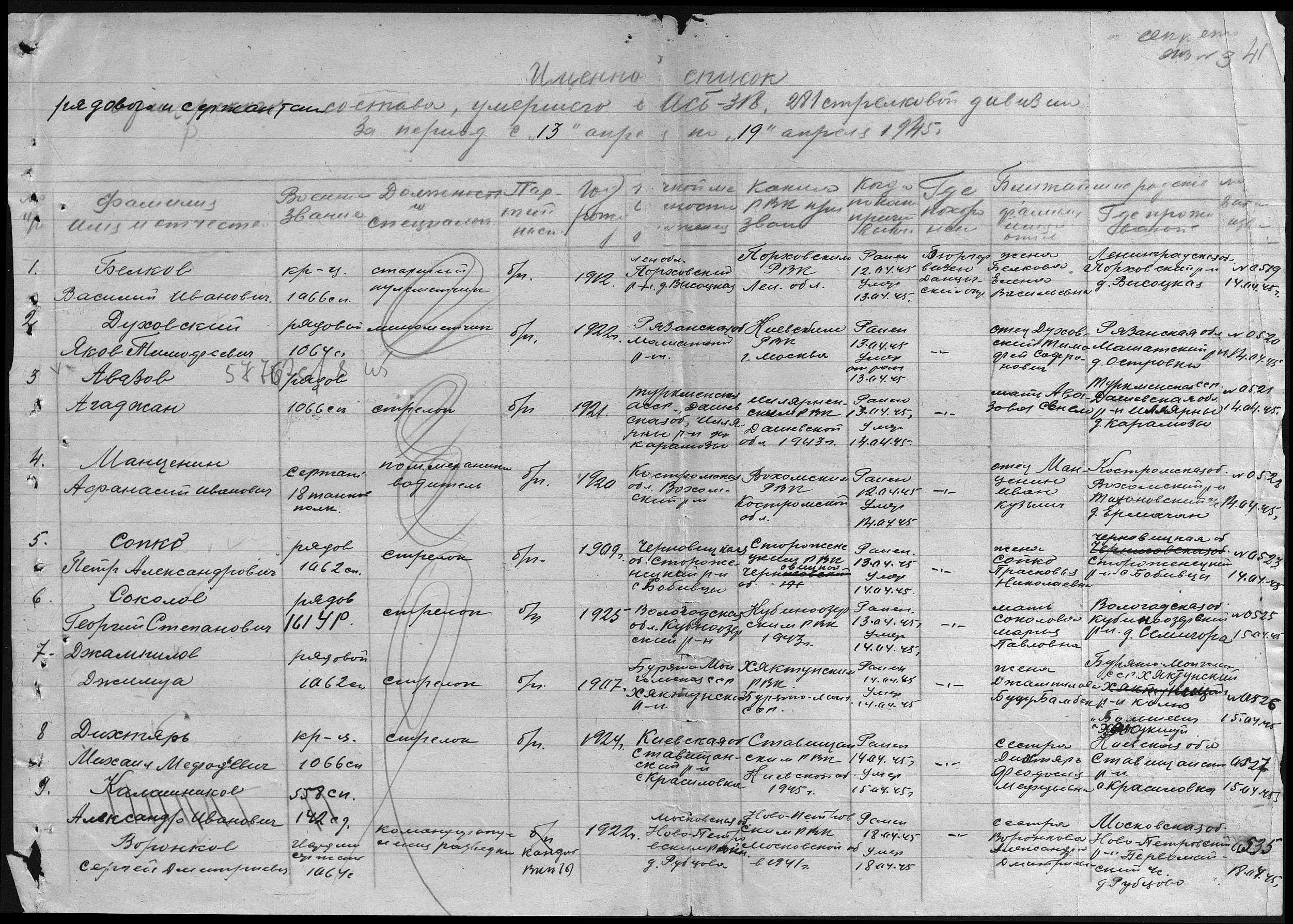 Именной список безвозвратных потерь начальствующего и рядового состава 289 стрелковой дивизии. Номер донесения 70 Перейти к списку
