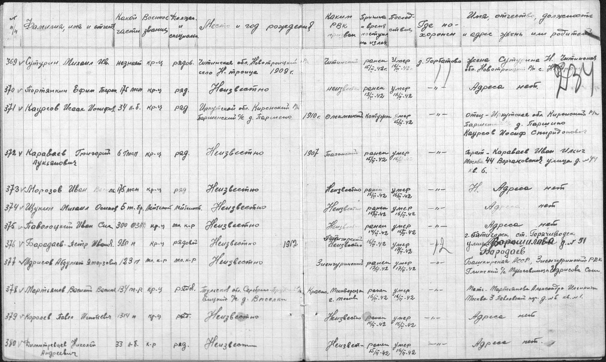 именные списки умерших. __.__.1942-__.__.1945. Источник: 3675 ЭГ. Страница 380 Перейти к списку
