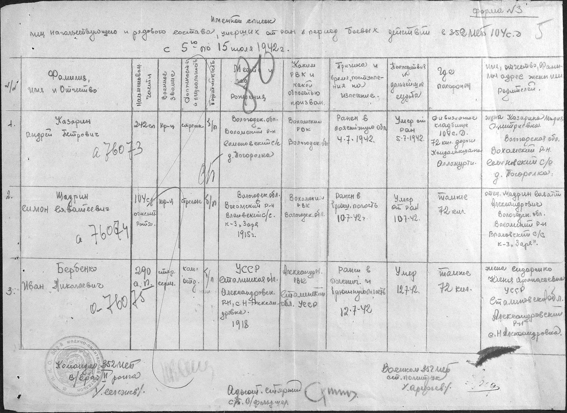 именные списки умерших. 10.06.1942-27.07.1943. Источник: 352 МСБ 104 сд. Страница 6 Перейти к списку
