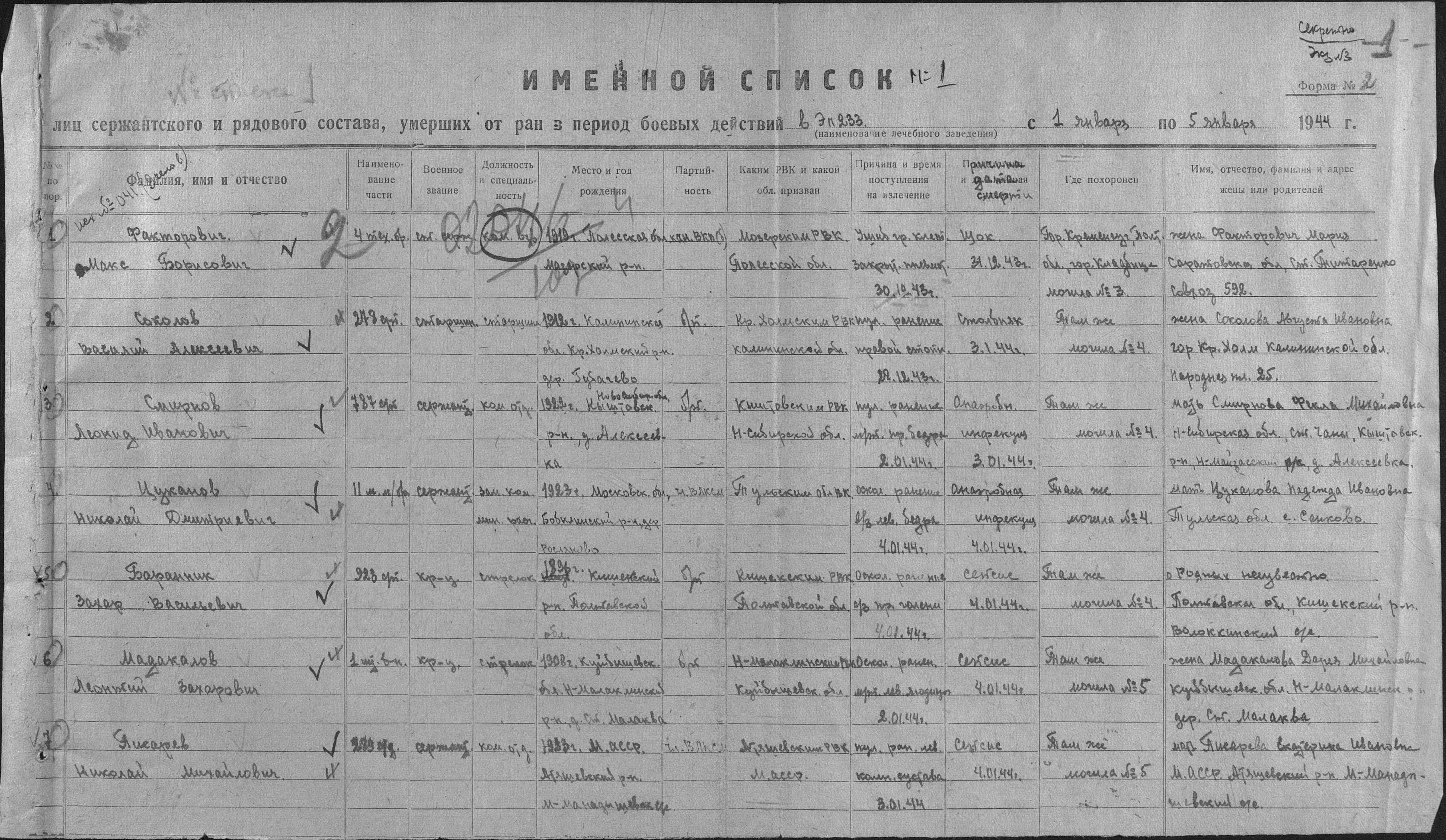 именные списки умерших. 01.01.1944-12.11.1944. Источник: 461 ОМСБ 368 сд. Страница 7 Перейти к списку