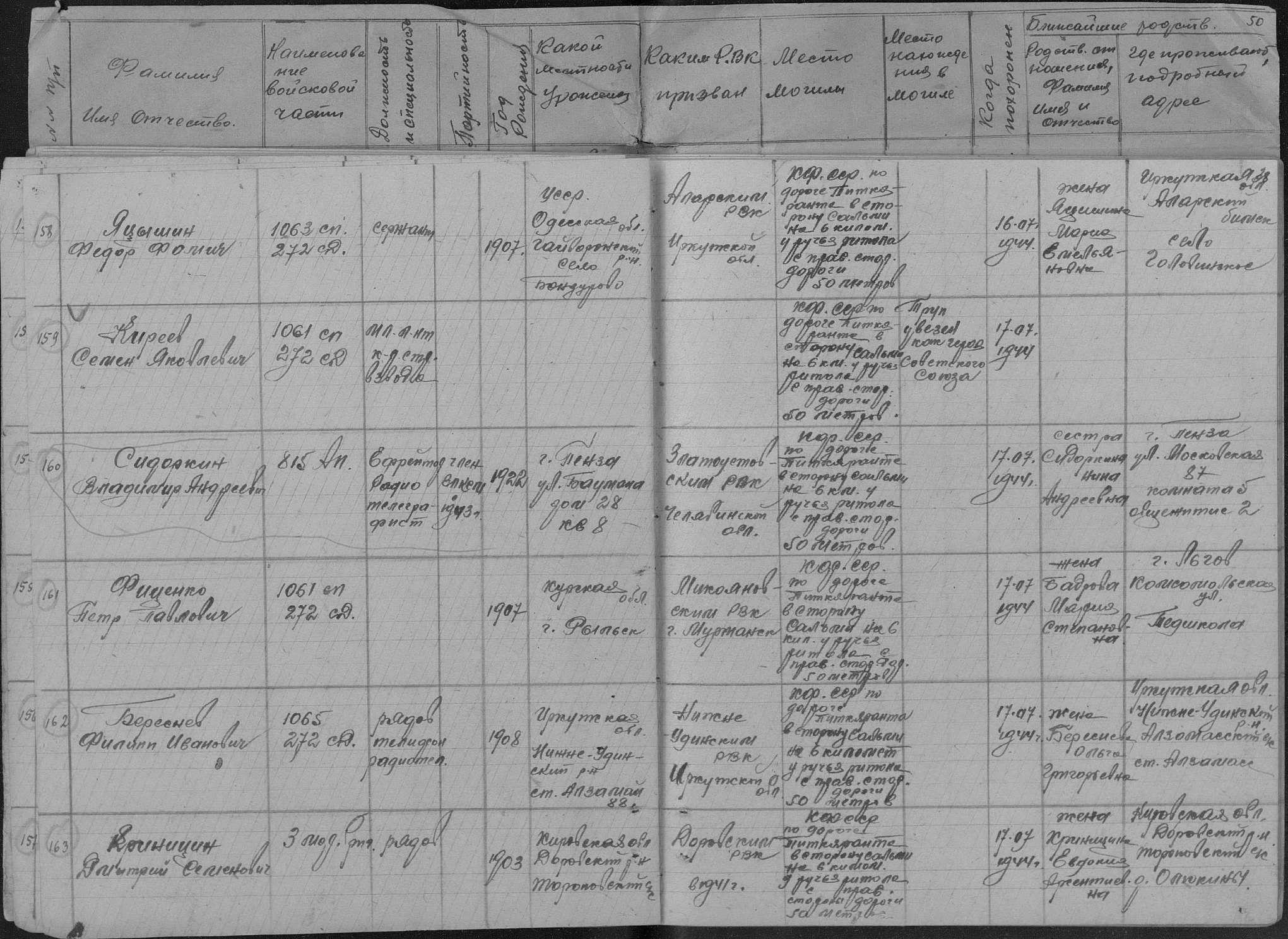 книга погребения. 13.06.1944-31.03.1945. Источник: 317 ОМСБ 272 сд. Страница 29 Перейти к списку