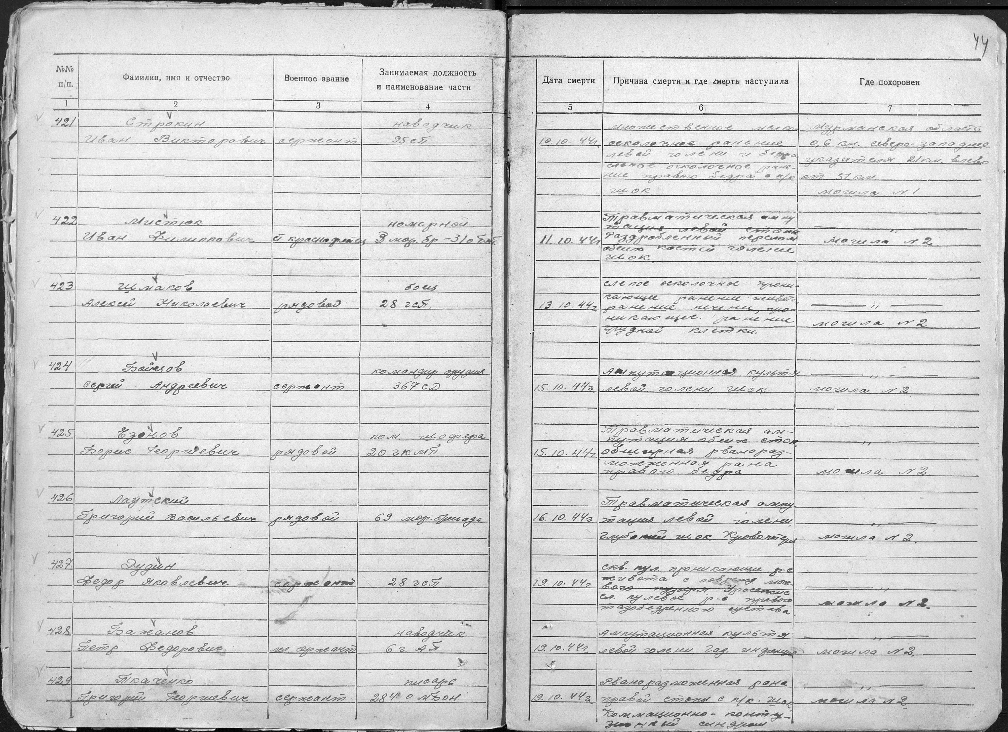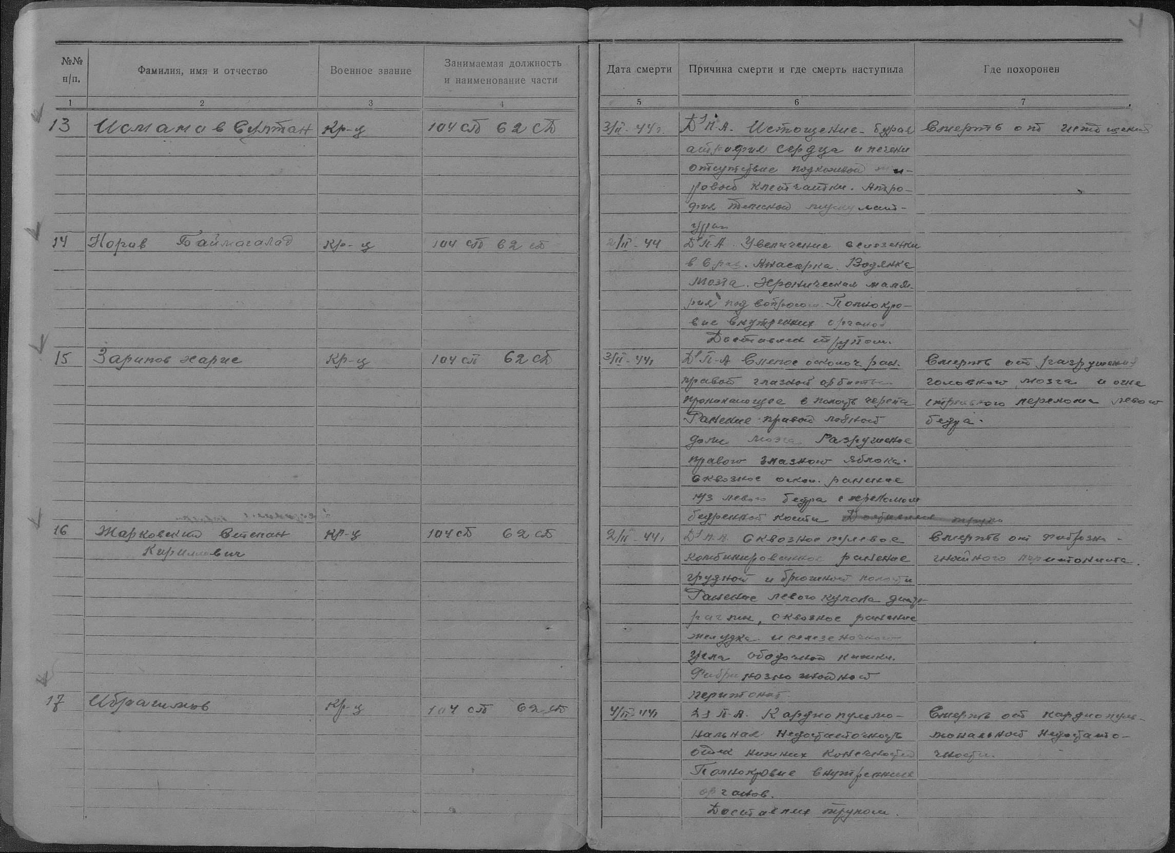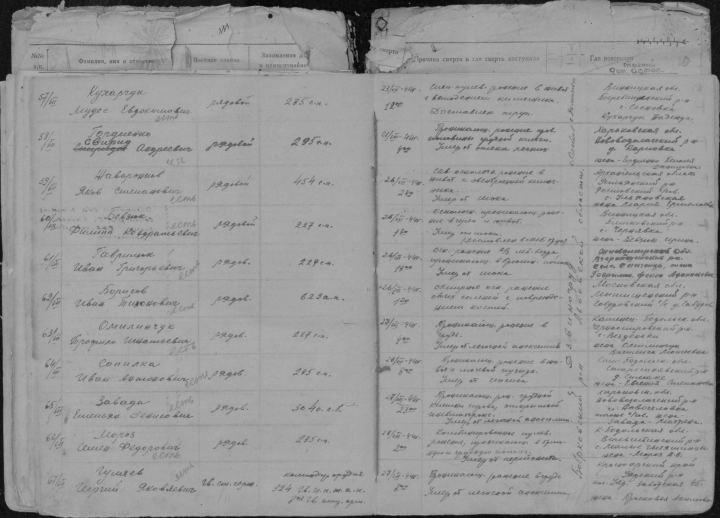 книга учета умерших. 01.01.1944-30.12.1944. Источник: 253 ХППГ. Страница 59 Перейти к списку