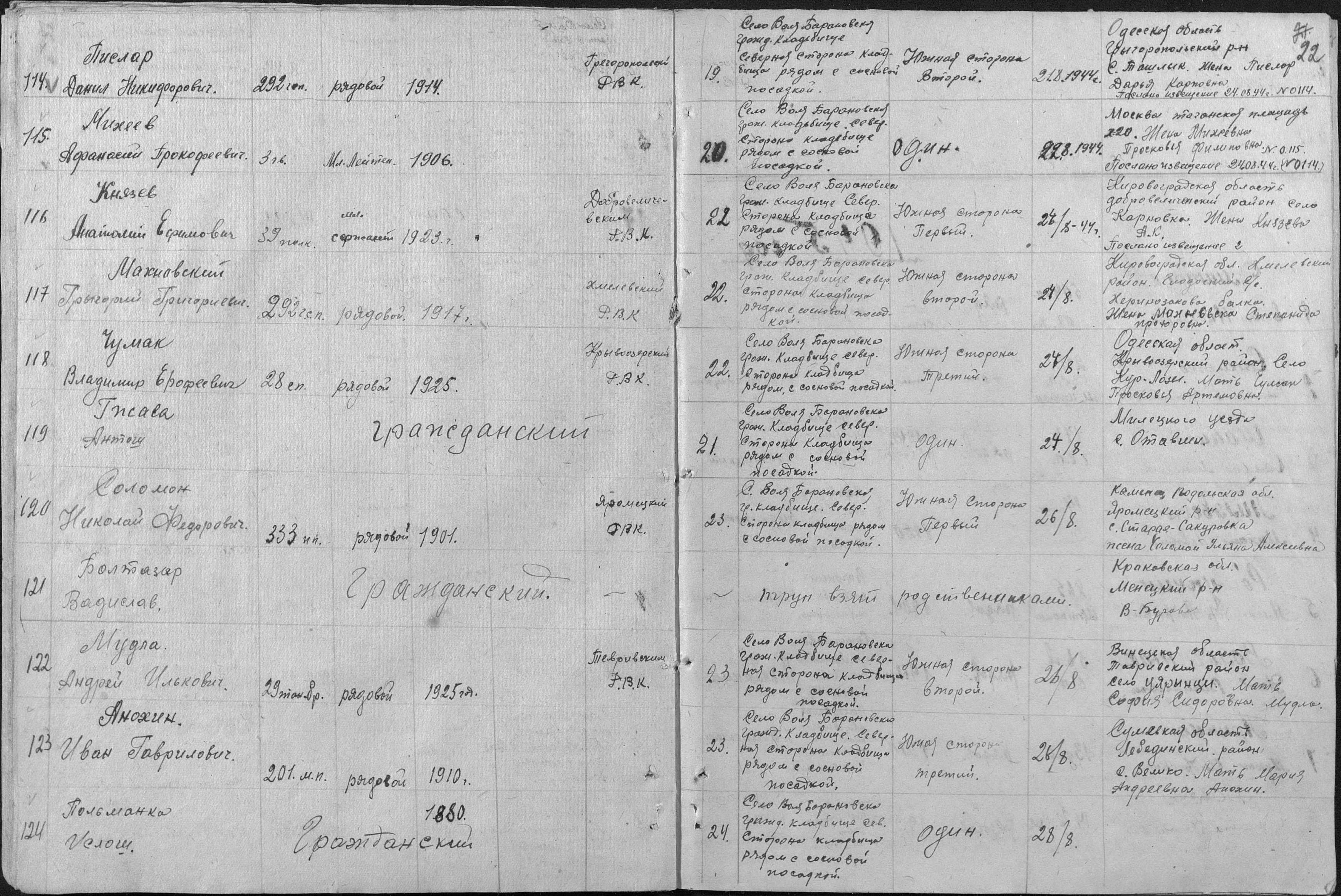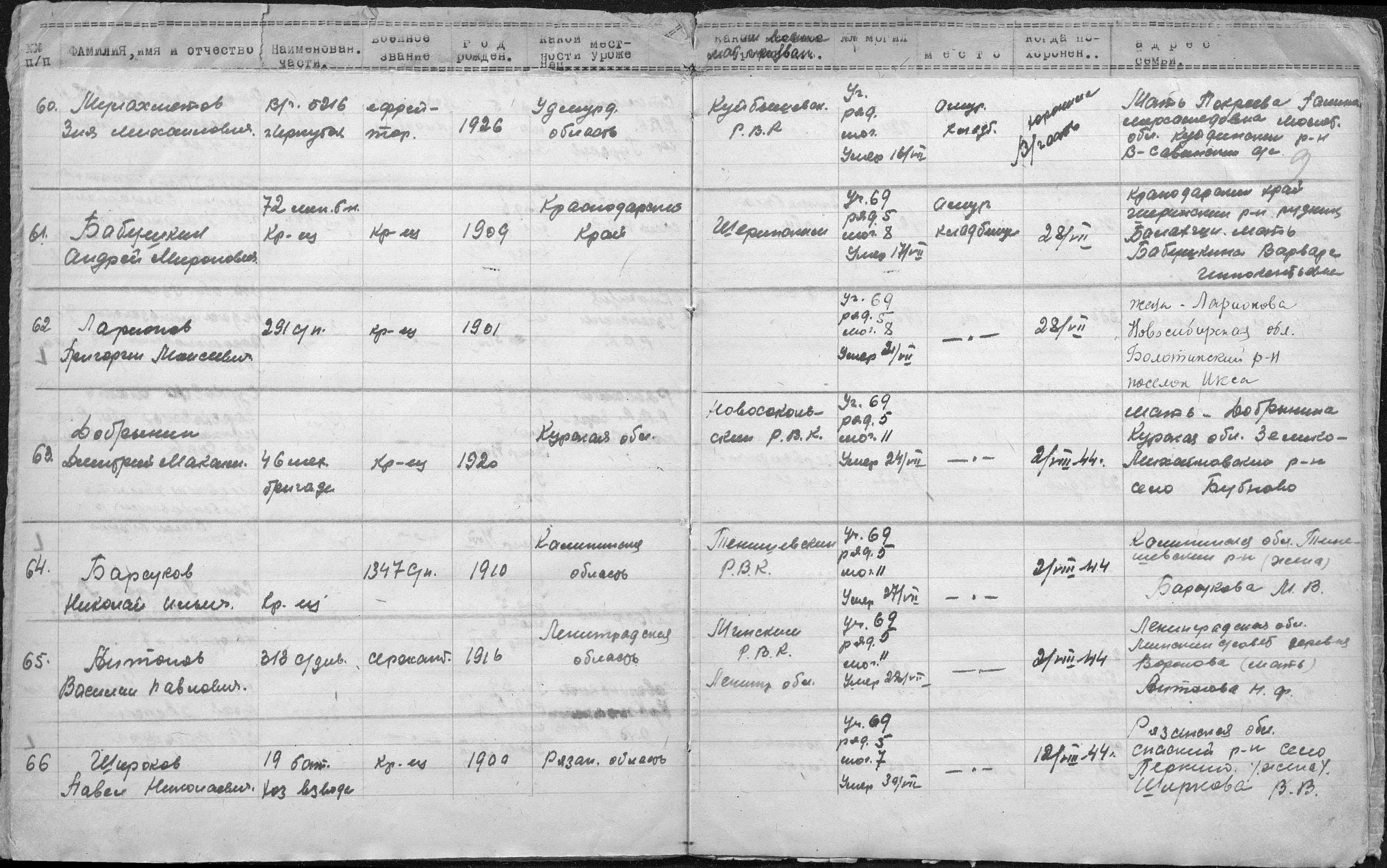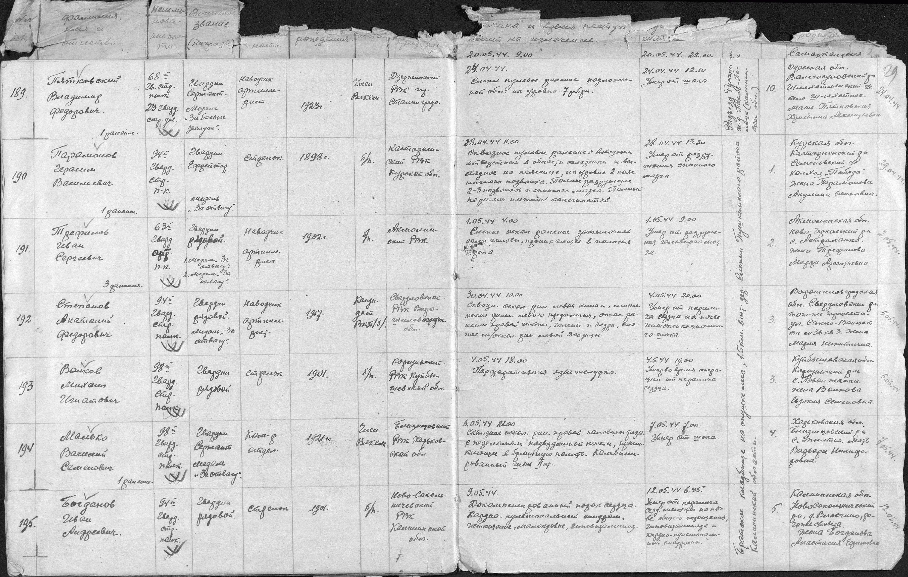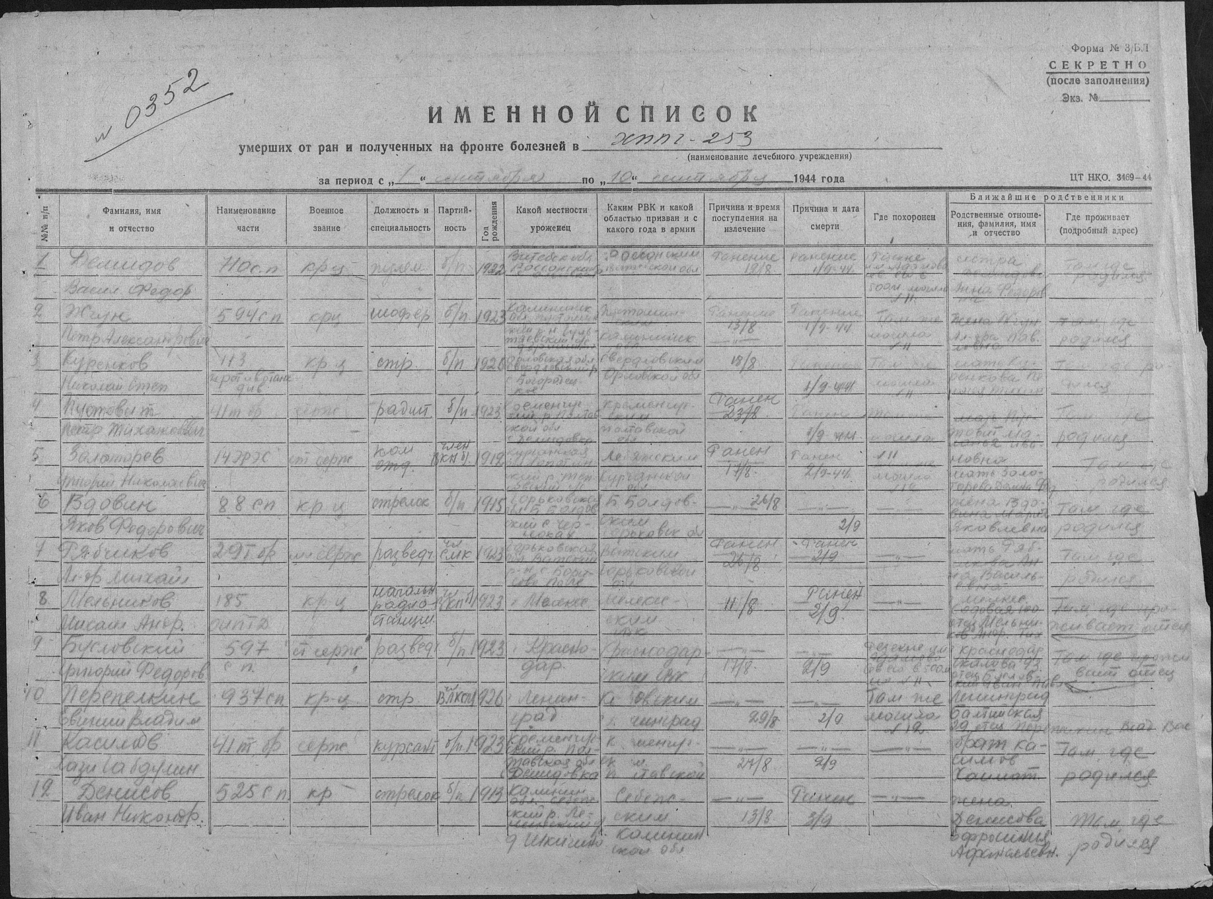книга учета умерших. 01.01.1944-30.12.1944. Источник: 253 ХППГ. Страница 59 Перейти к списку
