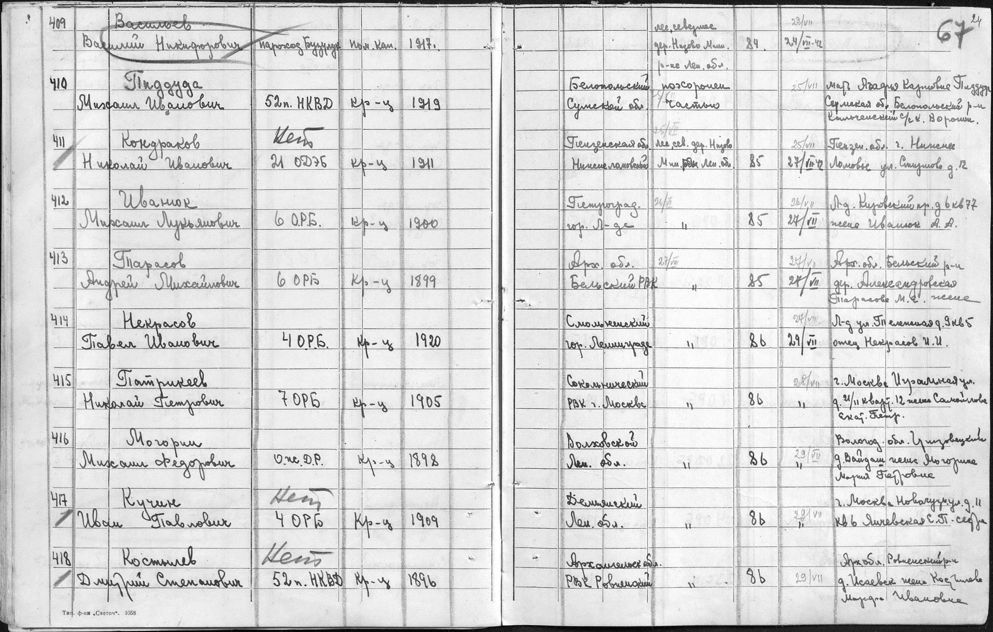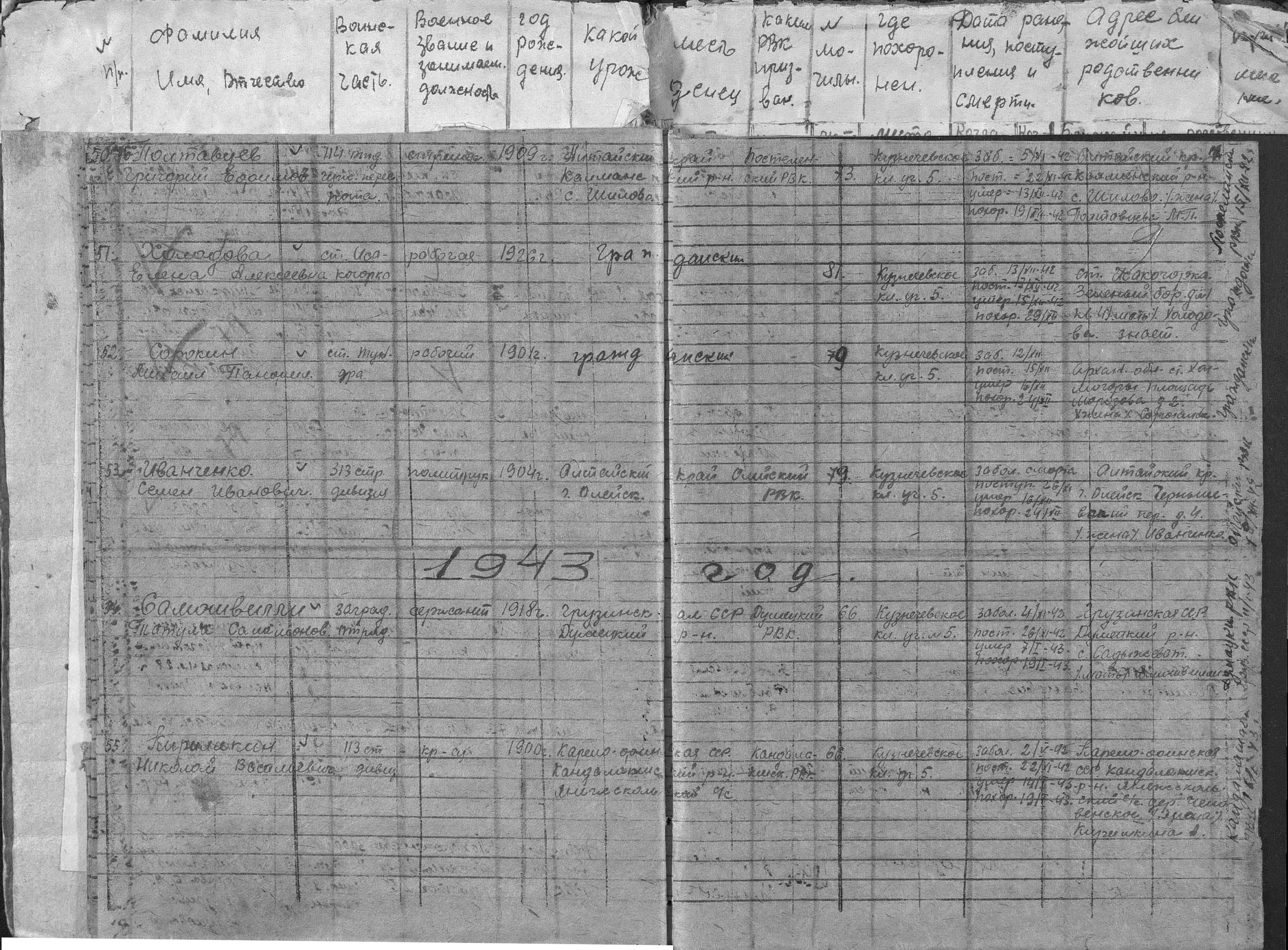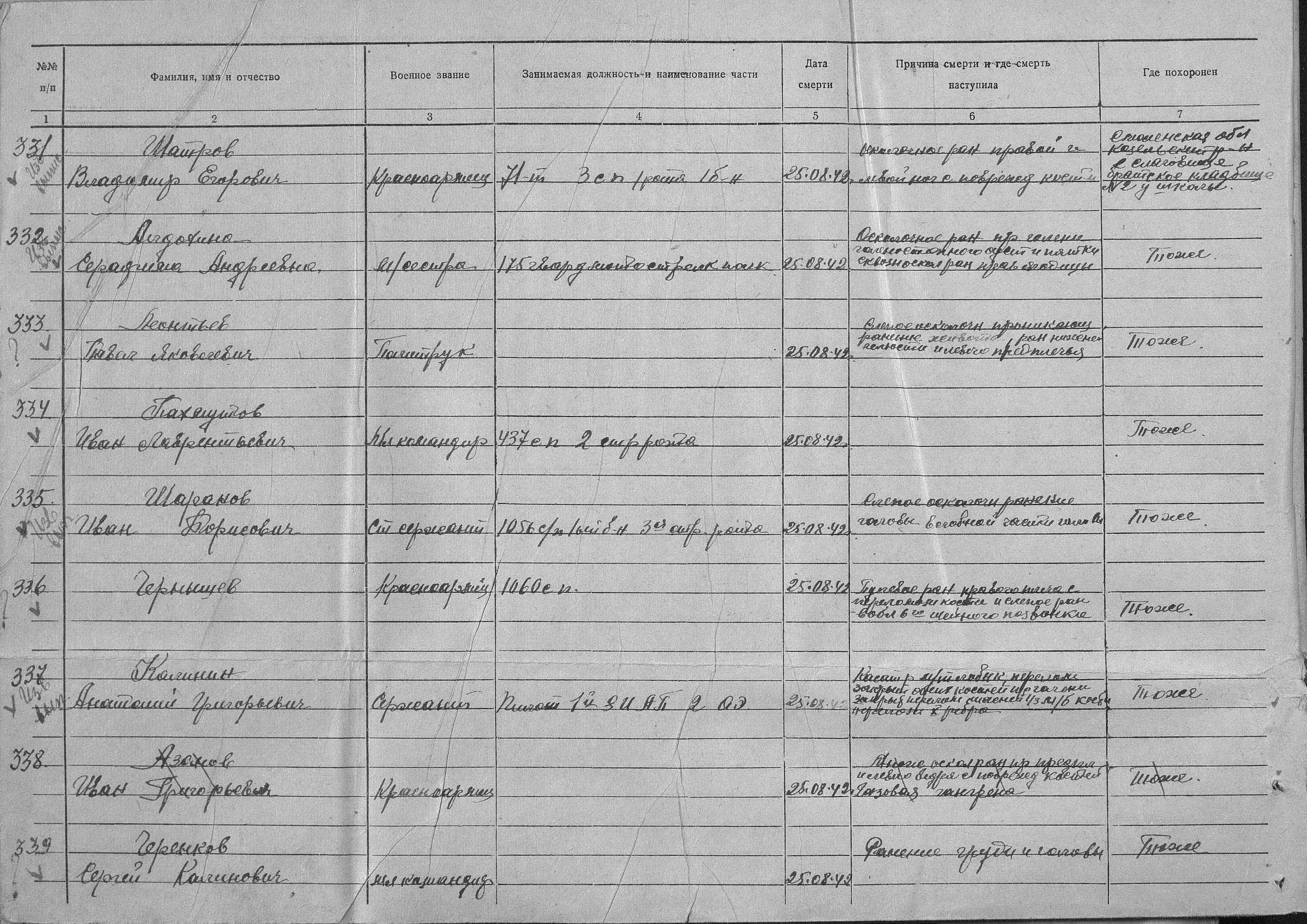 книга учета умерших. 01.01.1942-16.12.1942. Источник: 86 ХППГ. Страница 55 Перейти к списку