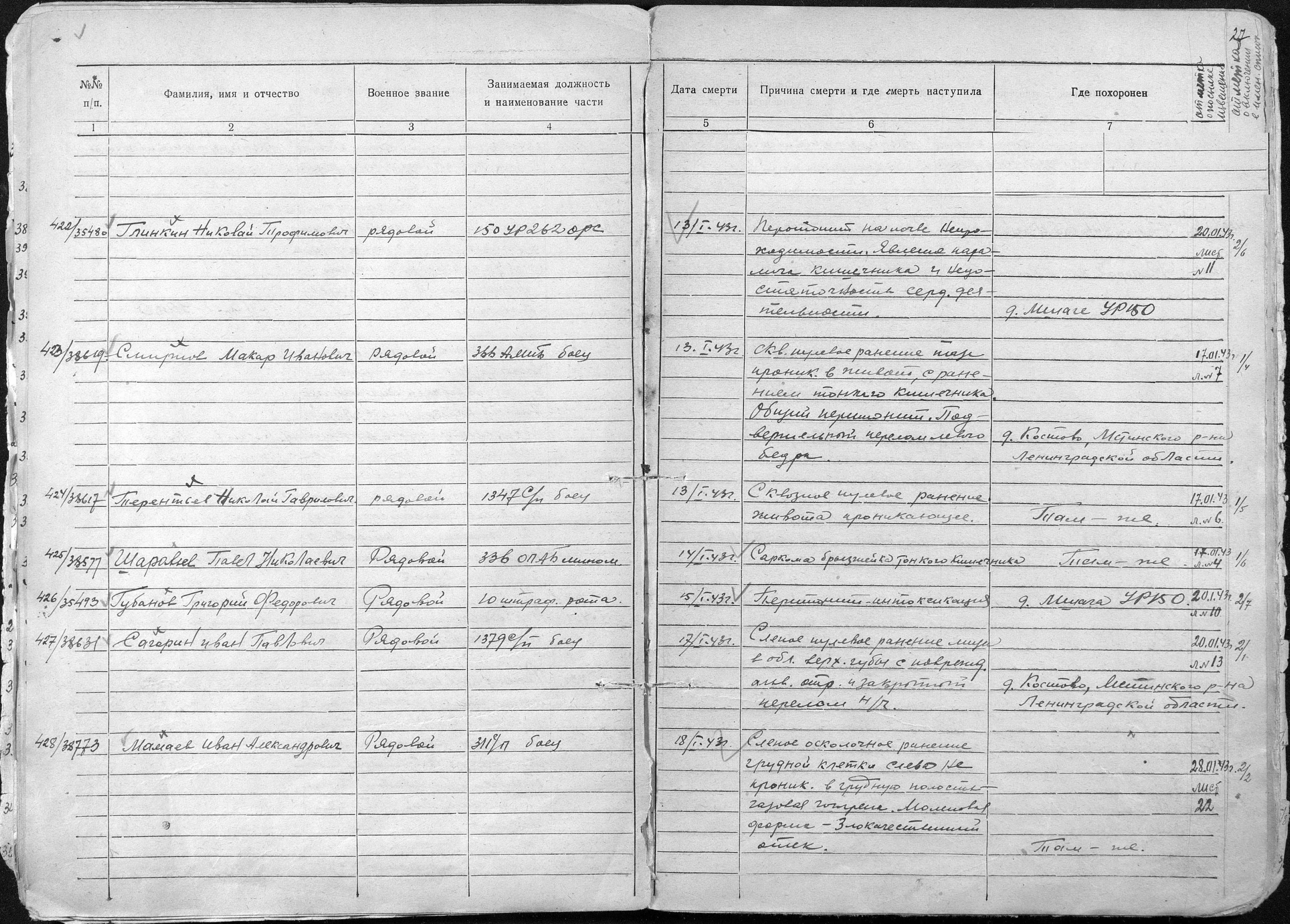 книга учета умерших. 01.01.1942-30.12.1943. Источник: 743 ППГ. Страница 21 Перейти к списку