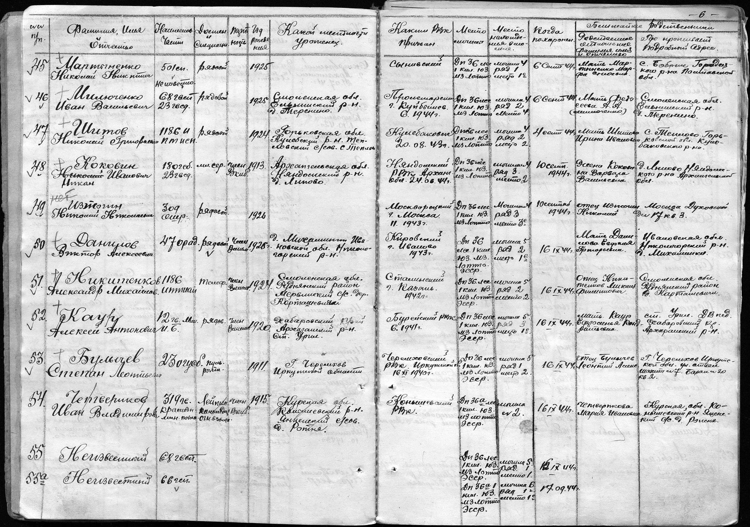 книга учета умерших. 25.08.1944-03.07.1945. Источник: 25 ОМСБ 23 гв. сд. Страница 6 Перейти к списку