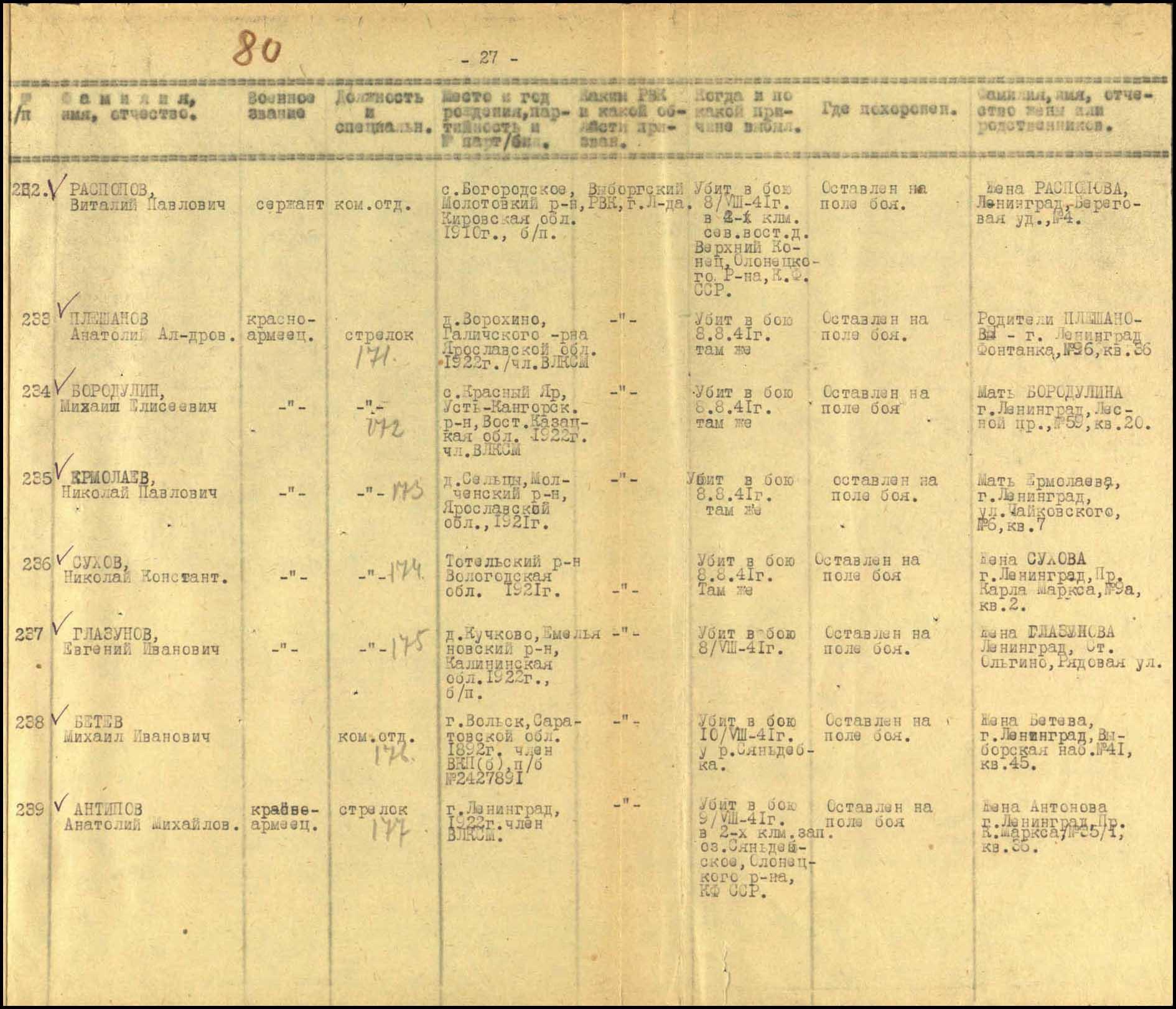 | о гибели 6 бойцов ополчения 8.08.1941 у д.Верхний Конец, трое из которых перезахоронены в Видлице, а мой дядя записан как Сухов и всё | Перейти к списку | |