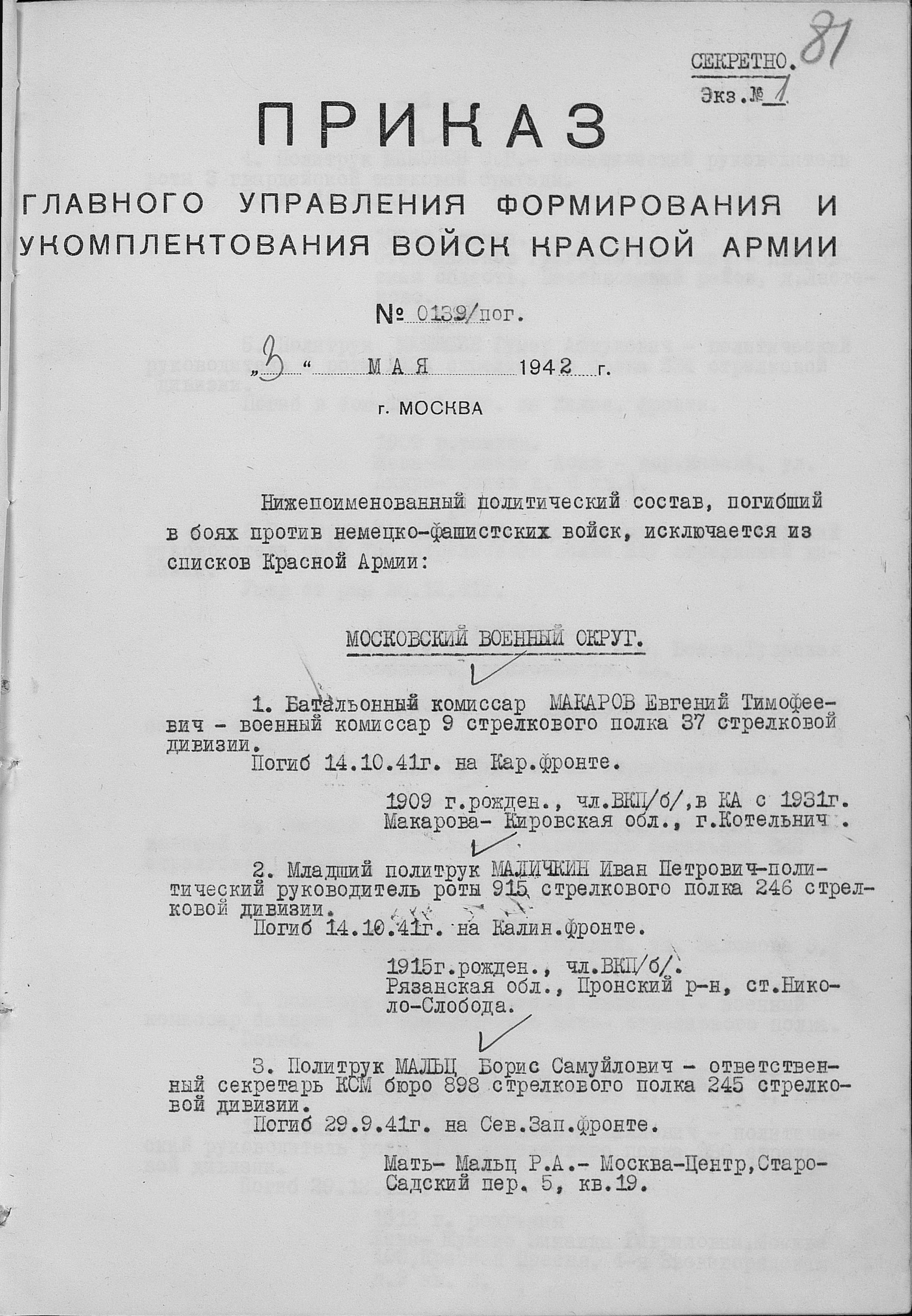 Приказ об исключении из списков. Номер 139. 03.05.1942. Источник: ГУФ и УВ КА. Страница 3 Перейти к списку