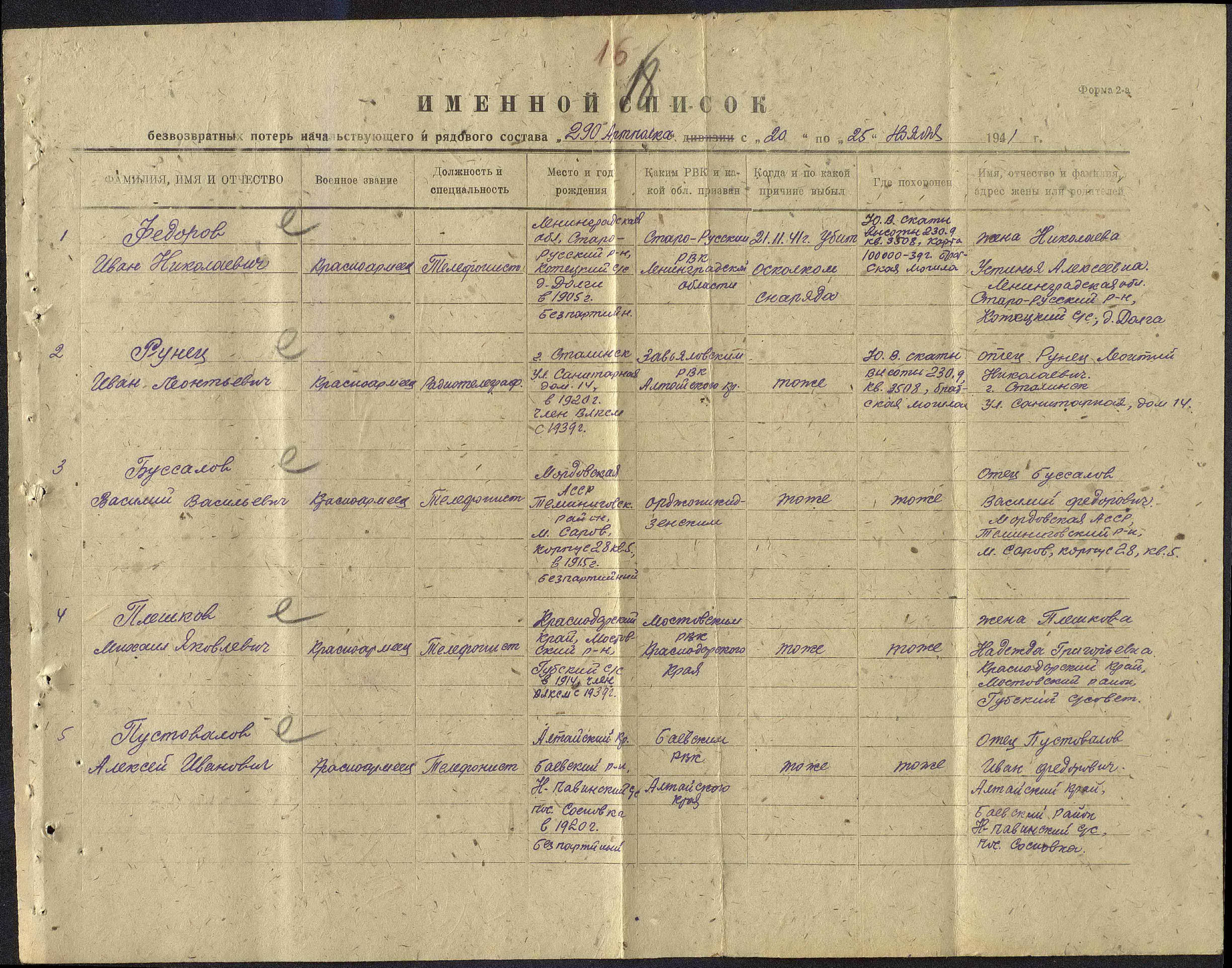 Место проживания родственников на момент призыва