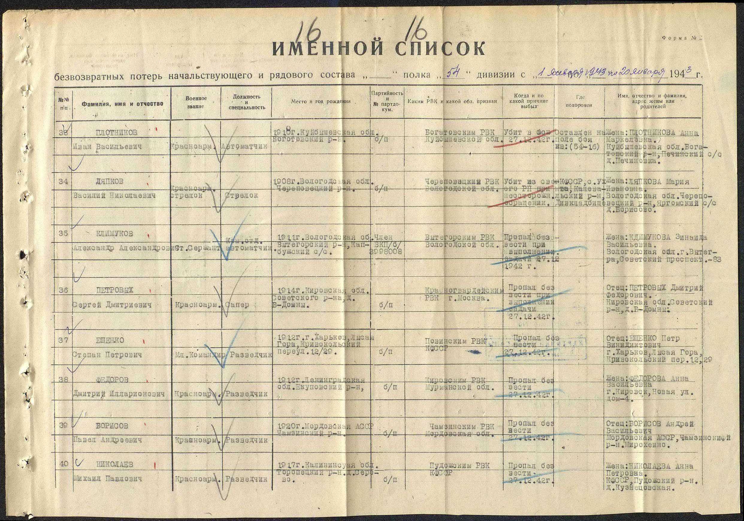 Место проживания родственников на момент призыва