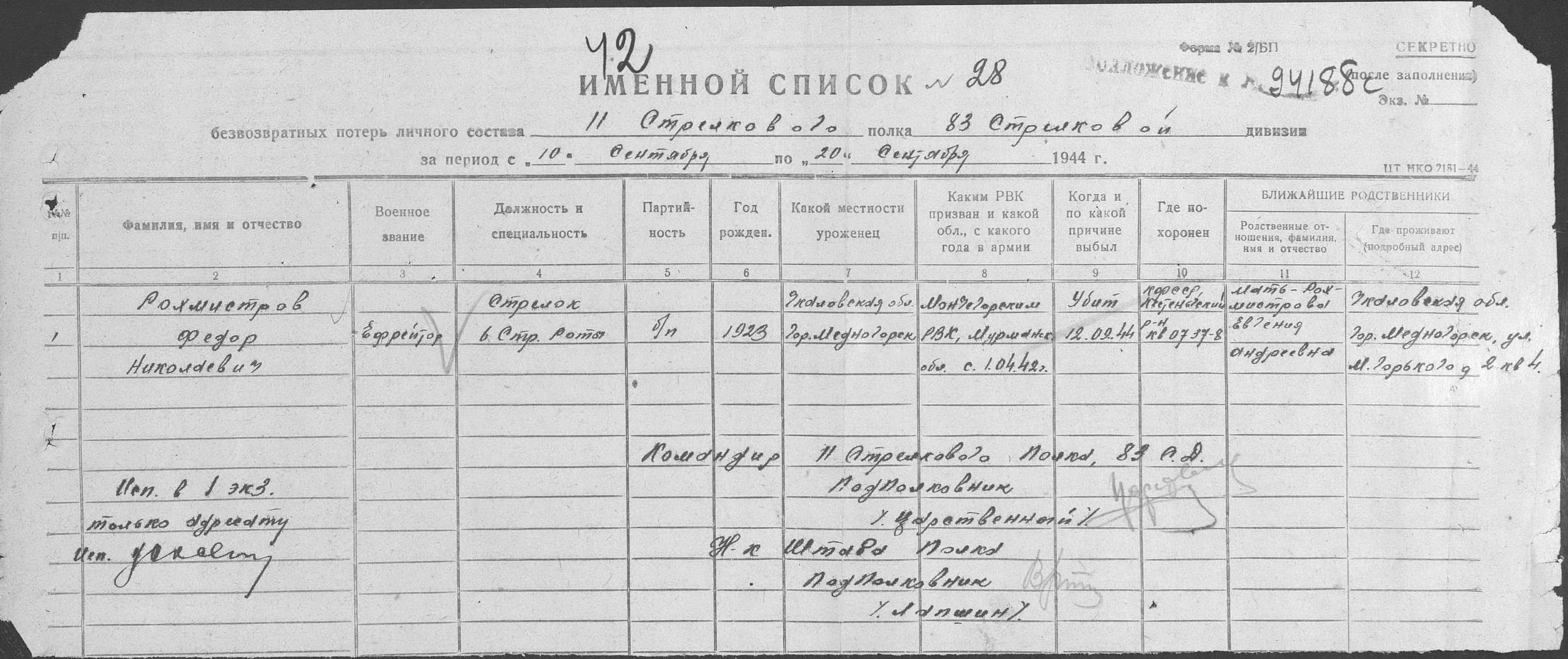 01.04.1942, Мончегорский РВК, Мурманская обл., Мончегорский р-н