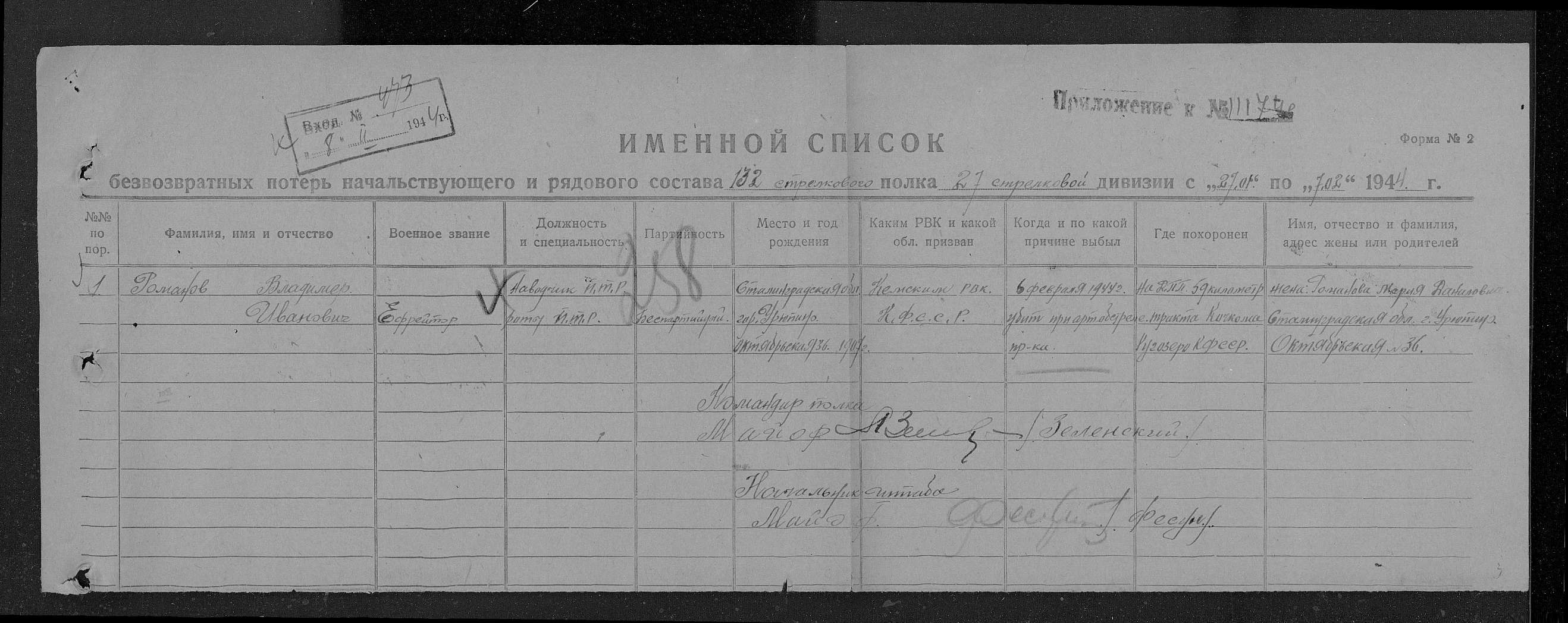 Жена Романова Мария Даниловна, Сталинградская обл., г. Урюпинск, ул. Октябрьская, 36
