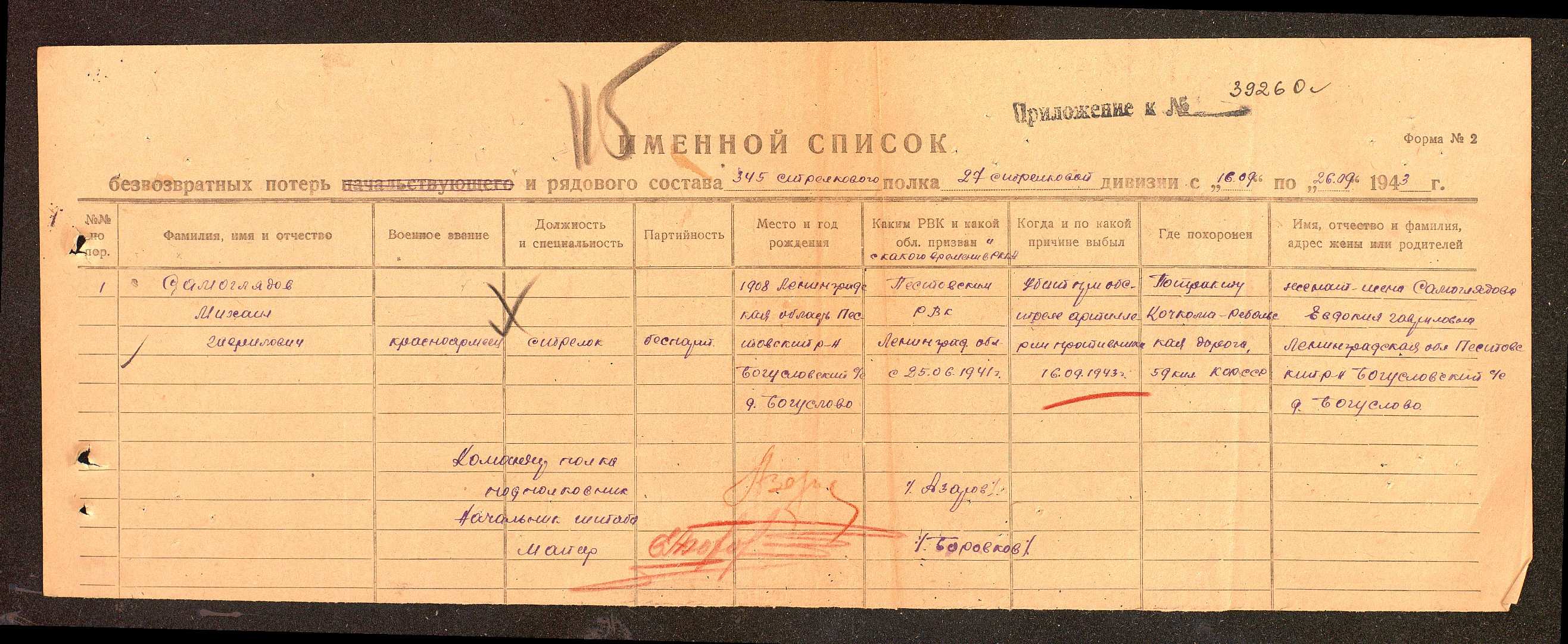 Жена: Самоглядова Евдокия Гавриловна, Ленинградская обл., Пестовский р-н, с/с Богусловский, с. Богуслово