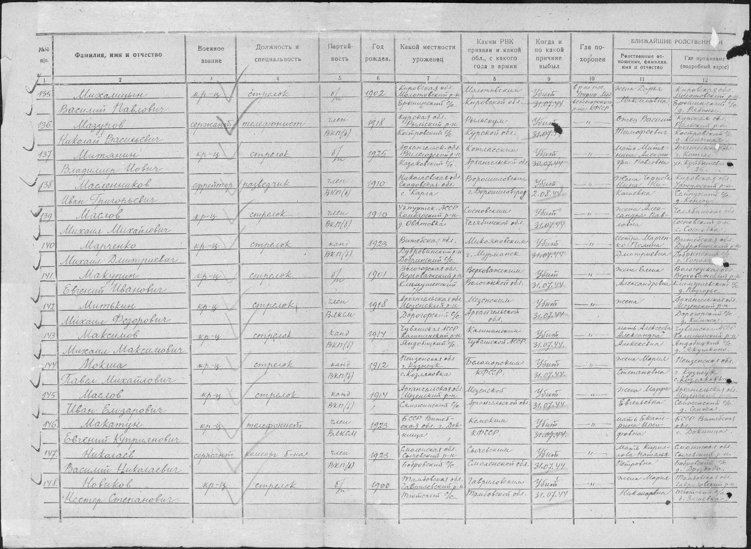 Место проживания родственников на момент призыва